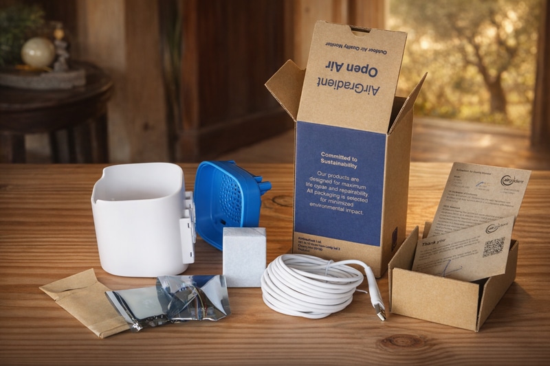 Das Unboxing war von Anfang an stimmig und durchdacht: eine ökologische, minimalistische Verpackung – ohne Überflüssiges. Der Indoor-Sensor kam fertig montiert an und ließ sich schnell integrieren. Nach der Einbindung in Home Assistant arbeitete er im Hintergrund mit – unaufgeregt und zuverlässig.